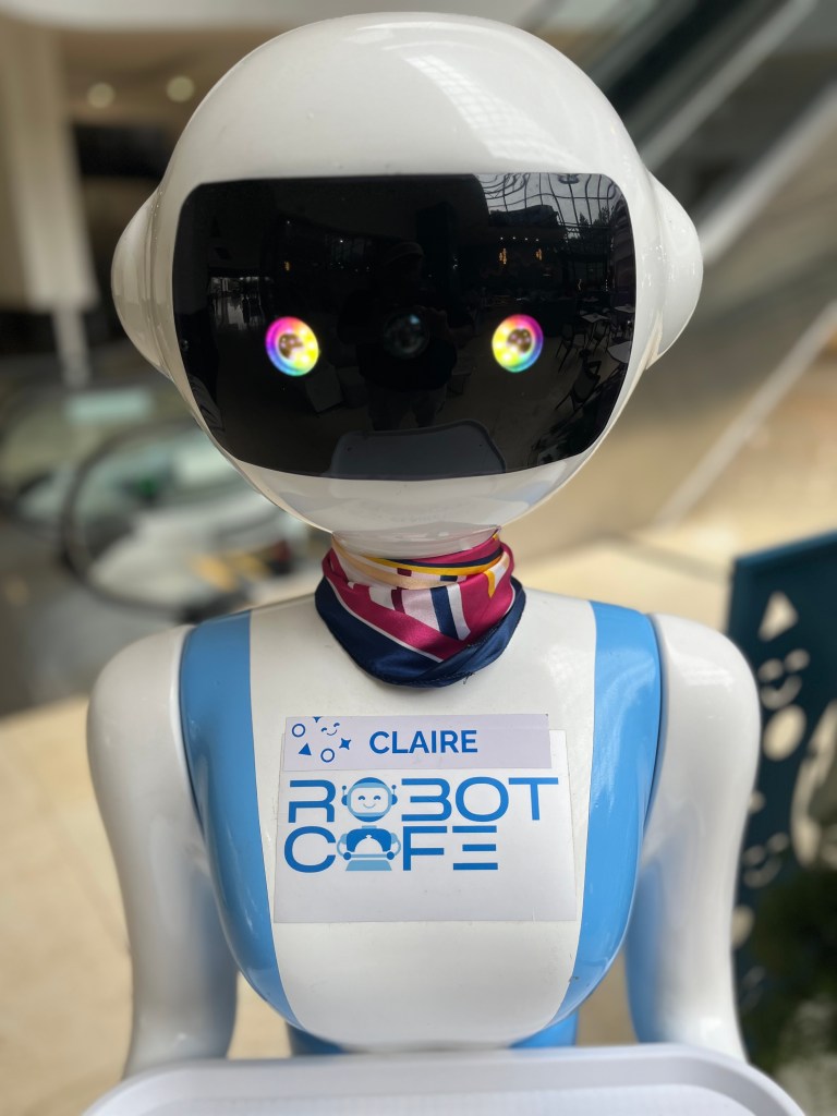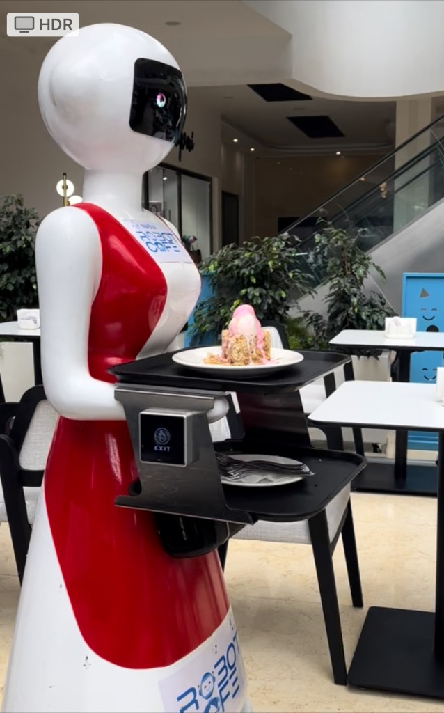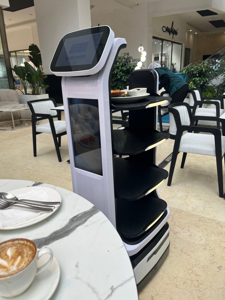 The food, when it comes, is OK. My sunny side up eggs were basically raw on top so I had to ask for them to be flipped and re-fried. Capuccino was OK. Whilst I was there a robot came out, carrying a small cake, whilst playing “Happy Birthday to you”.